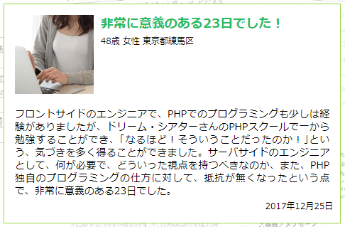 フロントサイドのエンジニアで、PHPでのプログラミングも少しは経験がありましたが、ドリーム・シアターさんのPHPスクールで一から勉強することができ、「なるほど!そういうことだったのか!」という、気づきを多く得ることができました。サーバサイドのエンジニアとして、何が必要で、どういった視点を持つべきなのか、また、PHP独自のプログラミングの仕方に対して、抵抗が無くなったという点で、非常に意義のある23日でした。